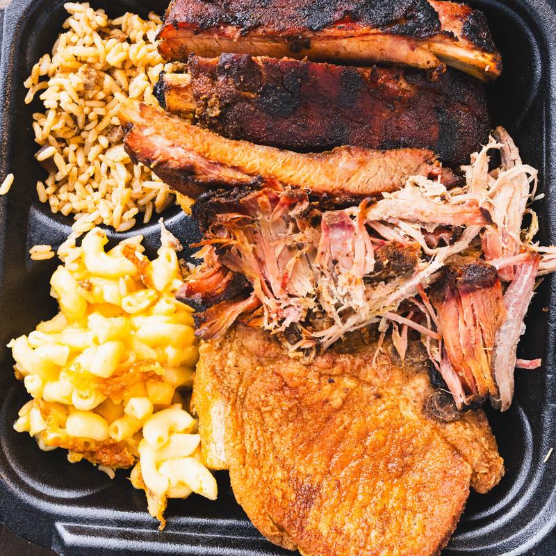 Sides: dirty rice, baked beans, mac & cheese, cabbage, green beans, collard greens, fries, potato salad, cole slaw, yellow rice, or chips.